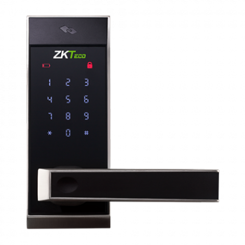 Cerradura inteligente autónoma con tarjeta y teclado Identificación por Mifare 13.56MHz, contraseña o APP móvil Capacidad 100 usuarios Comunicación Bluetooth 4.0 LED de estado de la cerradura Manilla reversible Salida libre y anti-pánico Instalación sin cables 4 Baterías estándar AA Modo "Puerta Abierta" Código de seguridad y autobloqueo Random Adaptable a puertas de 30 a 54 mm Cerradura mecánica con resbalón incluida Compatible con APP móvil ZK SmartKey